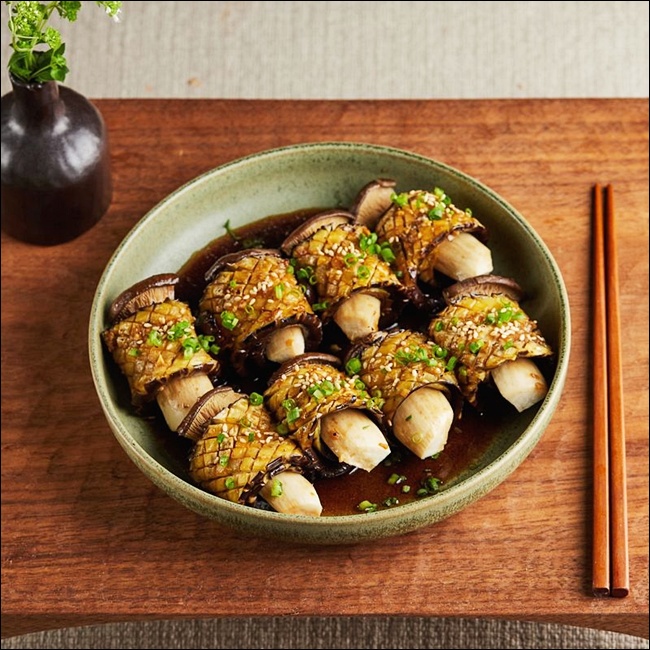 길게 썬 가지를 살짝 구운 후, 안에 맛살, 당근채, 부추 등을 넣고 돌돌 말아 팬에 구운 뒤 간장양념에 졸이면 완성! 마치 한식스러운 롤요리 느낌으로, 도시락 반찬으로도 인기가 많아요.