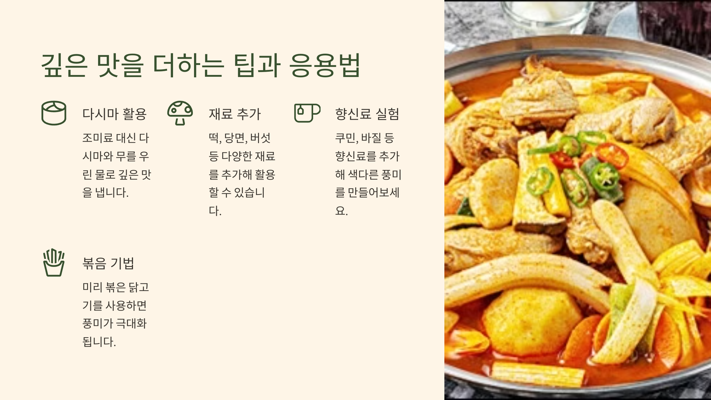 닭도리탕은 기본 레시피만 따라도 맛있지만, 몇 가지 팁만 추가하면 훨씬 깊고 풍부한 맛을 낼 수 있어요. 가장 먼저 추천하고 싶은 건 닭 육수 활용이에요. 닭 뼈로 우린 육수를 쓰면 훨씬 감칠맛이 강해져요.