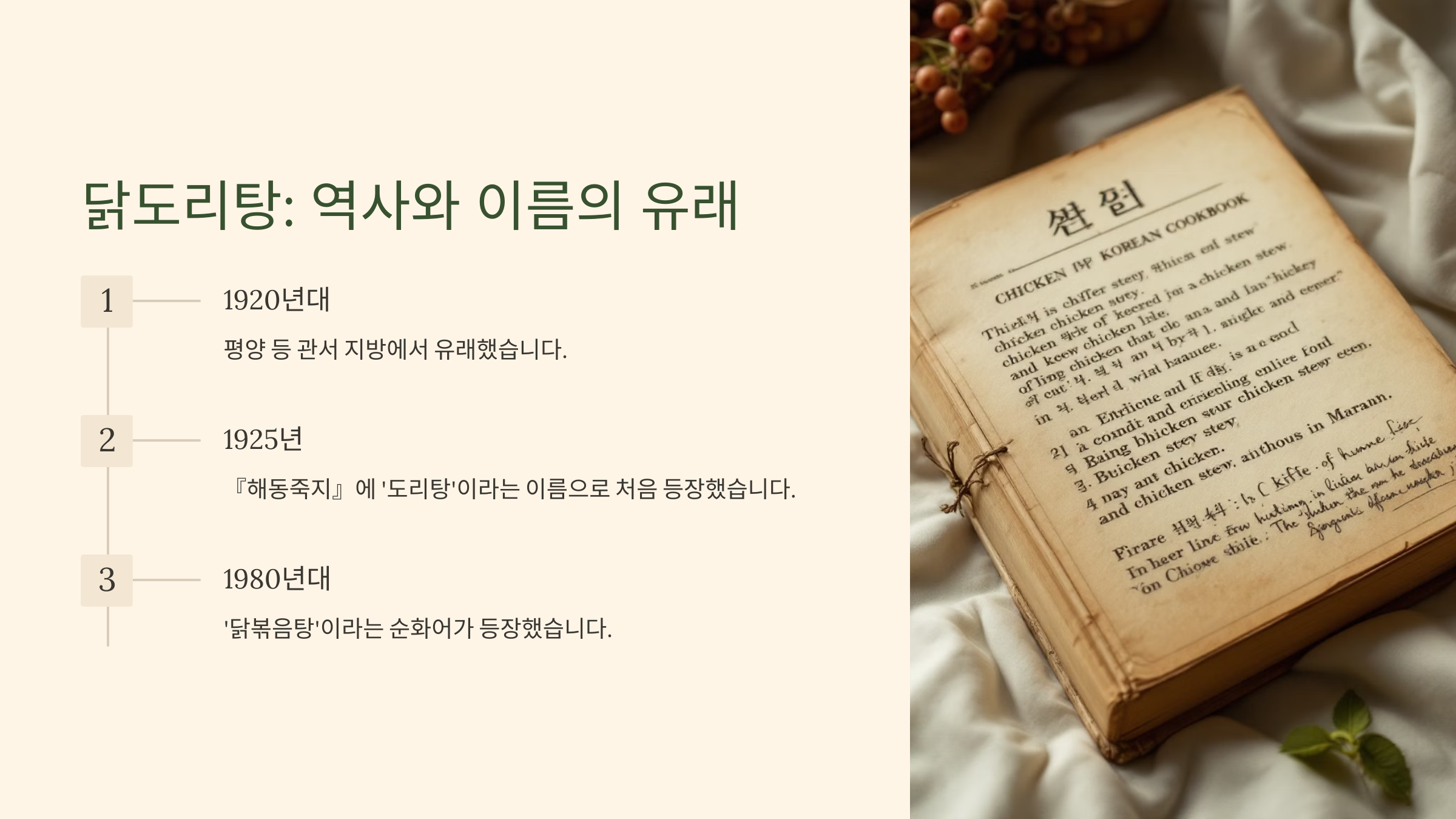 닭도리탕의 이름은 사실 조금 논란이 있던 부분이었어요. ‘도리’라는 단어가 일본어라는 주장도 있었고, 반대로 '도려낸다'는 순우리말에서 비롯되었다는 해석도 있었죠. 그래서 요즘엔 '닭볶음탕'이라는 이름이 더 많이 쓰이지만, 여전히 '닭도리탕'이라는 이름이 익숙하신 분들이 많답니다.