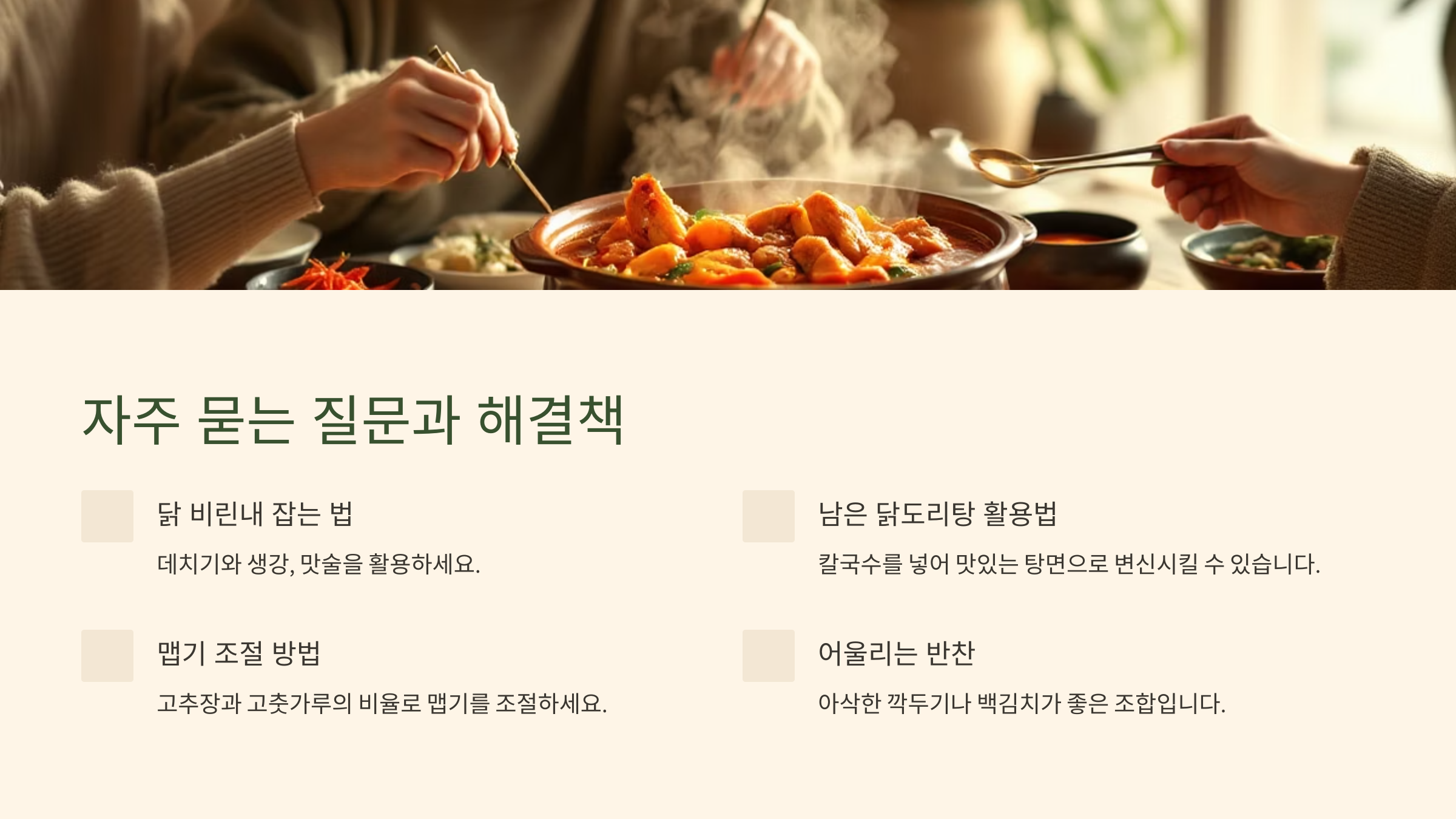 닭도리탕은 단순한 반찬을 넘어서, 보양식과 한 끼 식사, 술안주까지 다양한 역할을 해주는 다재다능한 요리예요. 국물이 자작하게 남아있다면 밥을 비벼 먹거나, 라면사리를 넣어 또 다른 메뉴로 즐길 수도 있죠!