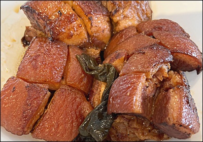또 하나 중요한 점은 껍질 쪽의 식감이에요. 껍질은 처음에 팬에 굽고, 졸이면서도 위쪽에 나오게 배치해요. 이렇게 해야 껍질이 너무 흐물흐물해지지 않고 쫄깃함을 유지해요. 이 조합이 바로 ‘겉은 쫀득, 속은 촉촉’한 동파육의 핵심이에요.