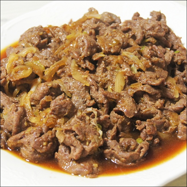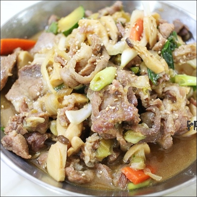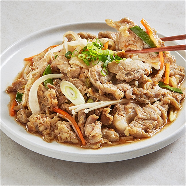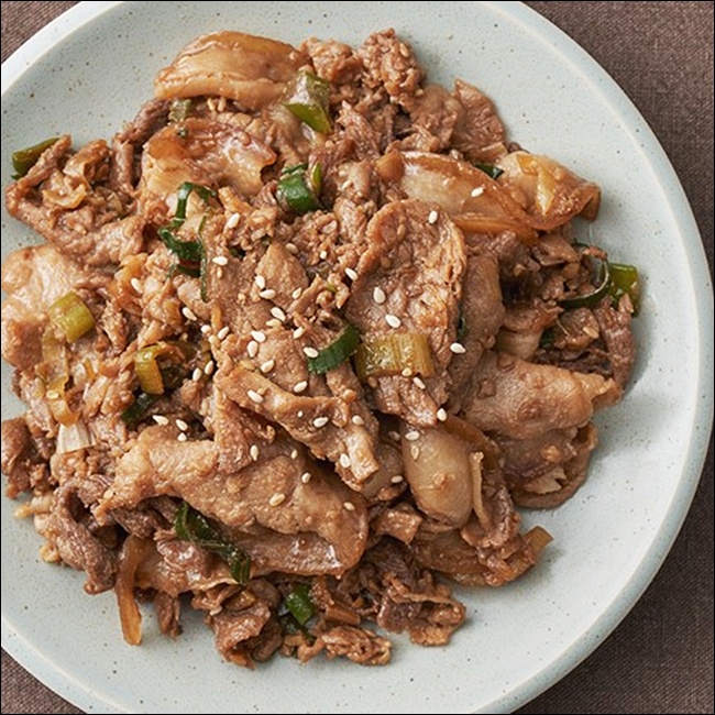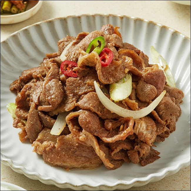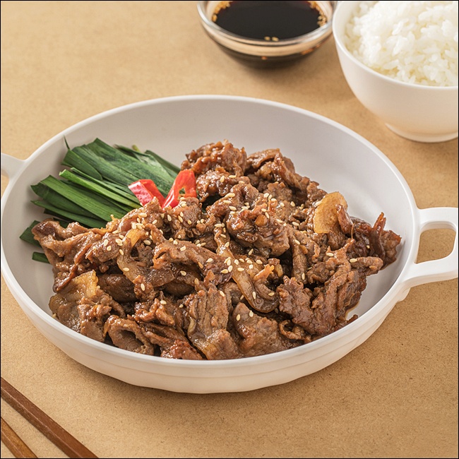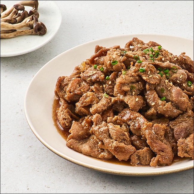 고기를 팬에 펼쳐서 넣고 한 면을 익힌 뒤, 한 번만 뒤집어주는 게 포인트예요. 여러 번 뒤적이면 물이 생기고 질겨지기 쉬워요. 고기가 어느 정도 익었을 때 양파, 파 같은 야채를 넣어 함께 볶아주면 양념이 배어들면서 깊은 맛이 나요.