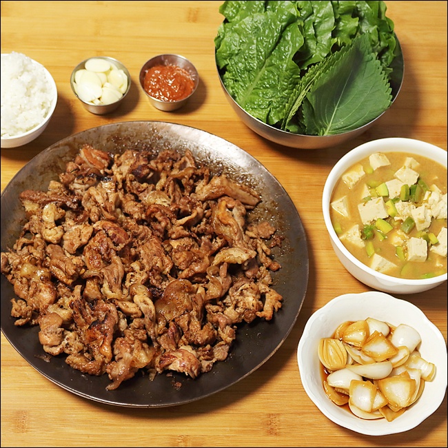 쌈채소도 절대 빼놓을 수 없어요. 상추, 깻잎, 치커리, 배추 등 다양한 채소 위에 돼지불고기를 올리고 마늘, 쌈장, 밥을 살짝 올려 한입에 먹으면 그야말로 입안이 축제예요! 깻잎은 돼지고기의 잡내를 잡아주고, 상추는 아삭한 식감이 좋아요.