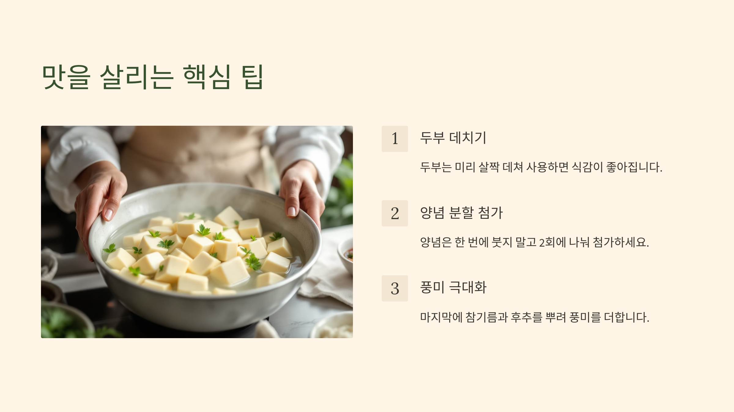 첫 번째는 ‘두부 굽기’예요. 두부는 물기를 최대한 제거한 후 기름을 넉넉히 두르고 앞뒤로 노릇하게 구워야 양념이 배어도 흐트러지지 않아요. 겉이 바삭하게 잡히면 양념을 부어도 두부가 흐물해지지 않죠.