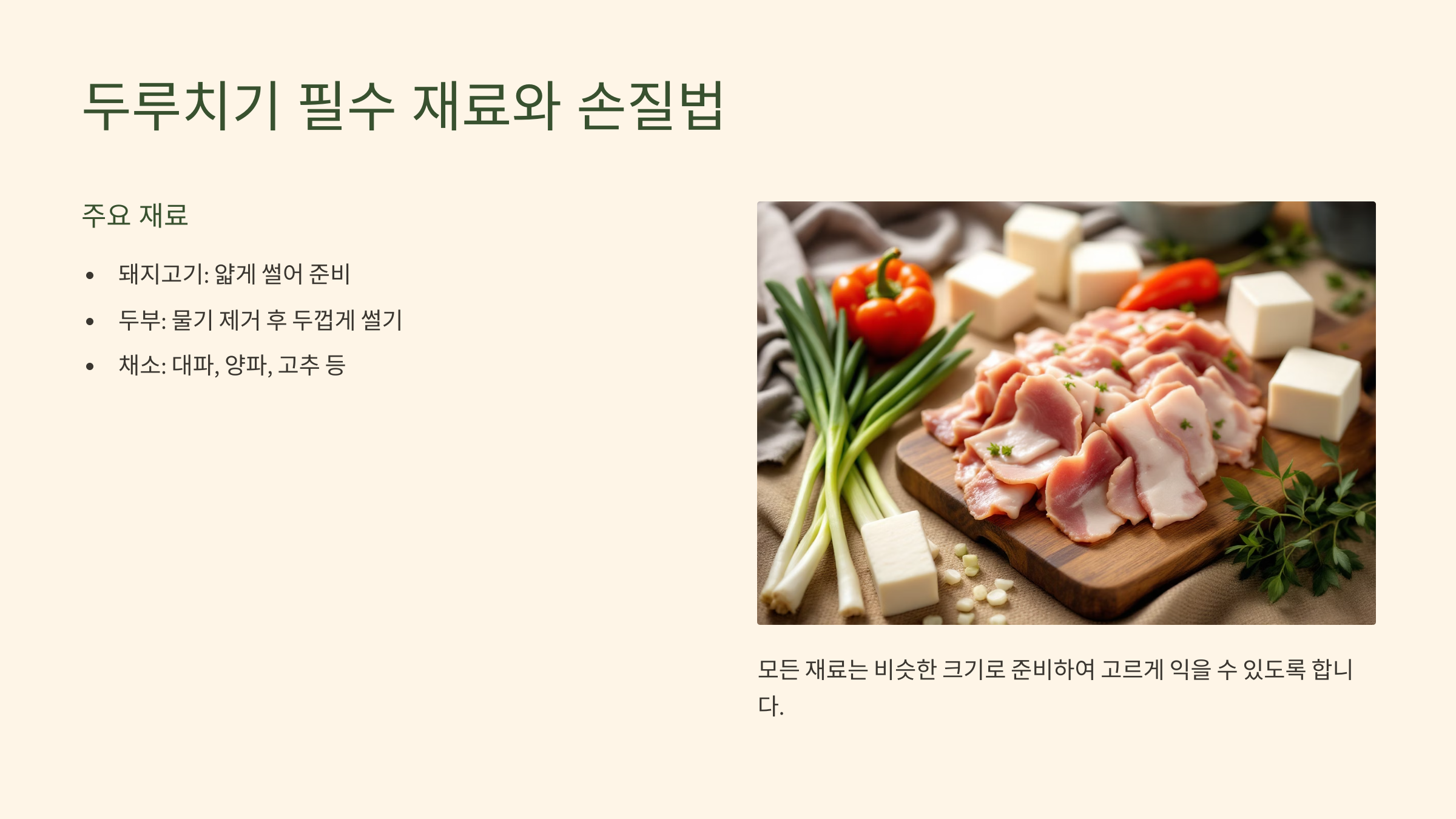 두부두루치기는 기본 재료만 갖추면 금세 만들 수 있어요. 재료 구성이 단순하지만 손질법에 따라 맛이 확 달라지기 때문에 포인트 몇 가지를 꼭 기억해두면 좋아요.