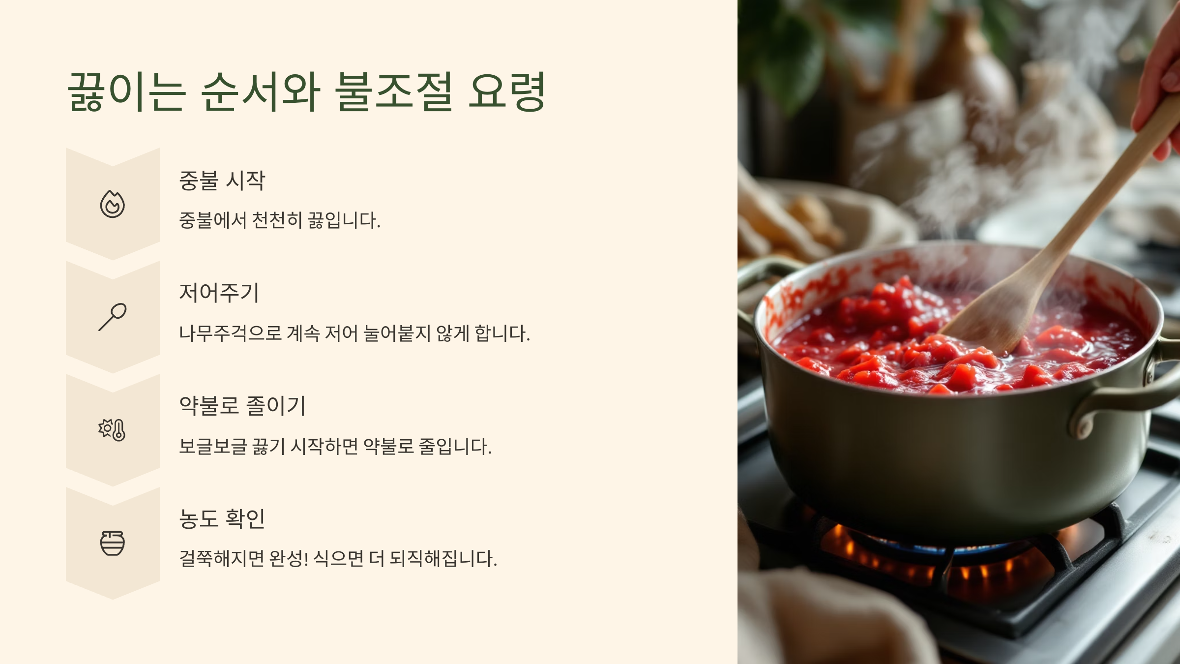 끓는 도중 주걱으로 저어가며 30~40분 정도 끓이는데, 이때 주기적으로 농도를 확인해요. 접시에 소량 떨어뜨렸을 때 퍼지지 않고 뭉치면 완성이에요. 너무 오래 끓이면 색이 탁해지고 맛도 날아가니 주의!