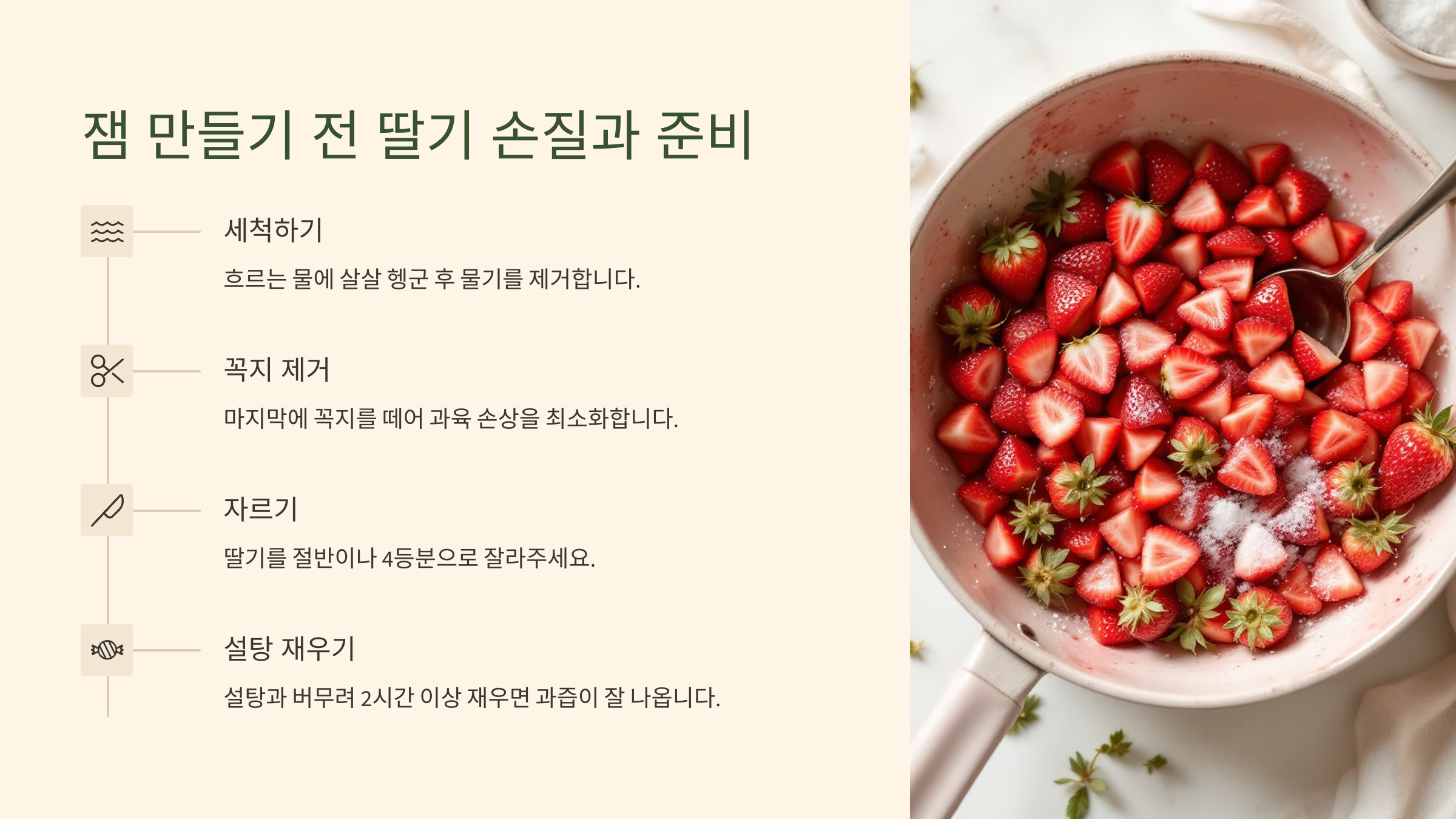 딸기를 잘 골랐다면, 이제 본격적인 조리를 위한 손질 과정이에요. 딸기잼을 맛있게 만들기 위해선 깨끗한 세척과 균일한 손질이 중요하답니다. 생각보다 이 과정이 맛을 좌우해요!