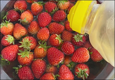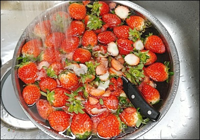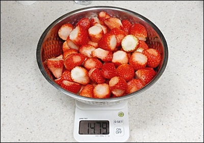 딸기는 흐르는 물에 한 알씩 조심스럽게 헹궈줘야 해요. 너무 세게 문지르면 과육이 손상돼 잼을 만들 때 색이 탁해지고 맛이 떨어질 수 있어요. 꼭지를 자르기 전 세척하는 게 포인트예요. 꼭지를 자른 상태로 씻으면 물이 과육 속으로 들어가 식감이 떨어지거든요.