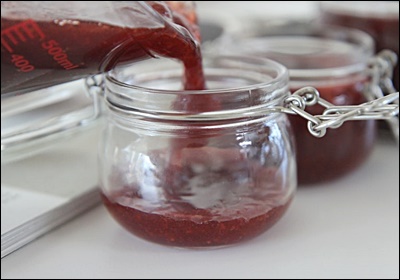 끓인 딸기잼을 뜨거운 상태에서 바로 소독한 유리병에 담아야 진공 상태가 잘 형성돼요. 이때 병 입구에 잼이 묻지 않게 주의해야 하고, 병을 완전히 채우지 말고 약간 여유를 두는 게 좋아요.