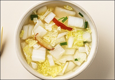A4. 생수에 소금, 설탕, 배즙을 섞은 후 조금씩 부어주면 돼요. 원래 국물 맛을 살리려면 찹쌀풀도 소량 넣어주세요.