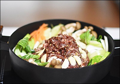 재료는 아래쪽에 단단한 버섯류, 윗부분에 부드러운 팽이나 쑥갓 등을 올리는 식으로 배치하면 익는 시간도 맞고, 보기에도 예뻐요. 중간에 다진 마늘 1작은술, 국간장 1큰술, 참기름 1/2큰술을 넣어 간을 맞추면 깊은 향이 살아나요.