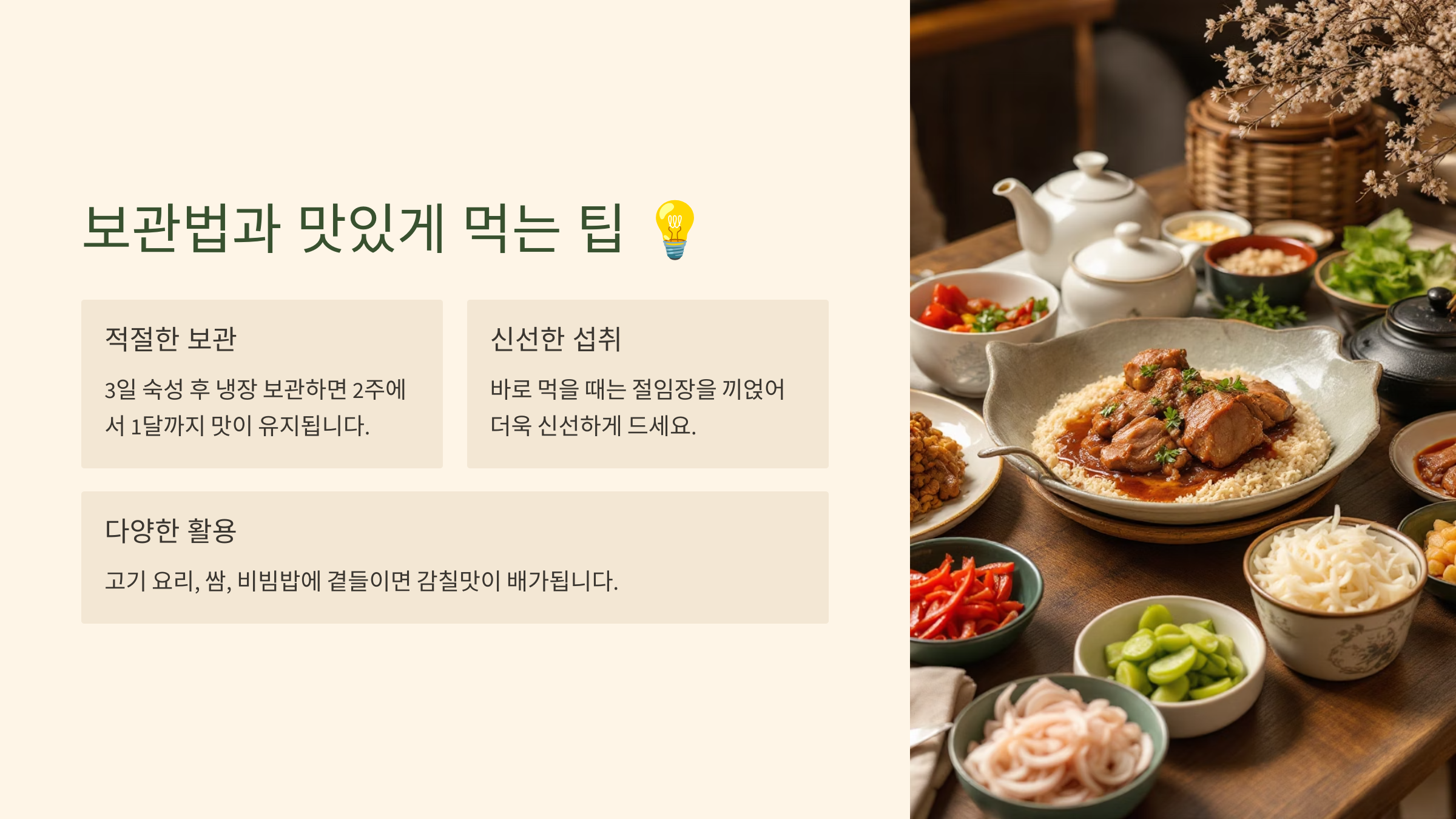 처음 담근 후 최소 48시간 숙성해야 맛이 제대로 배어요. 이틀 후부터는 새콤달콤한 풍미가 살아나고, 일주일 후에는 더욱 깊은 맛이 나요. 먹을 때마다 젓가락을 깨끗하게 사용해줘야 변질을 방지할 수 있어요.
