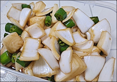 1단계는 양파 썰기예요. 껍질 벗긴 양파를 2~3cm 큼직하게 썰어 준비해요. 청양고추나 홍고추도 함께 슬라이스하면 좋고, 마늘은 통으로 넣으면 좋아요. 손질한 재료는 채에 밭쳐 물기를 최대한 말려줘야 해요.