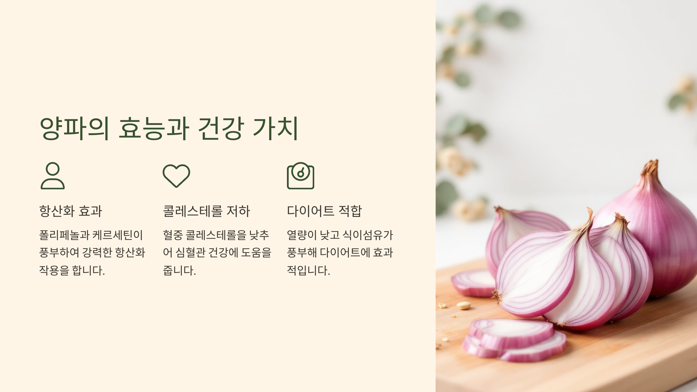 양파는 오래전부터 ‘천연 항생제’라 불릴 만큼 건강 효능이 뛰어난 식재료예요. 알싸한 향 속에는 퀘르세틴이라는 성분이 풍부한데, 이건 혈관 건강을 도와주고 항산화 작용을 해주는 폴리페놀의 일종이에요. 꾸준히 섭취하면 고혈압과 동맥경화 예방에도 좋아요.