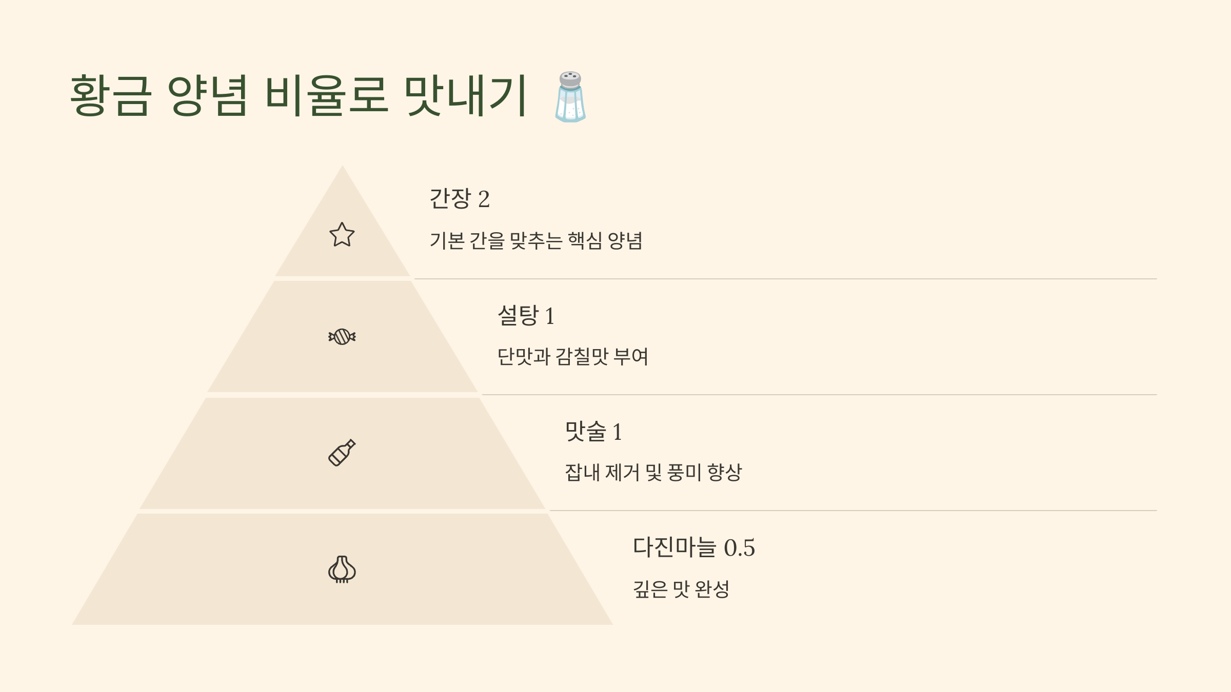 | 간장 | 3큰술 | 짠맛, 감칠맛 |