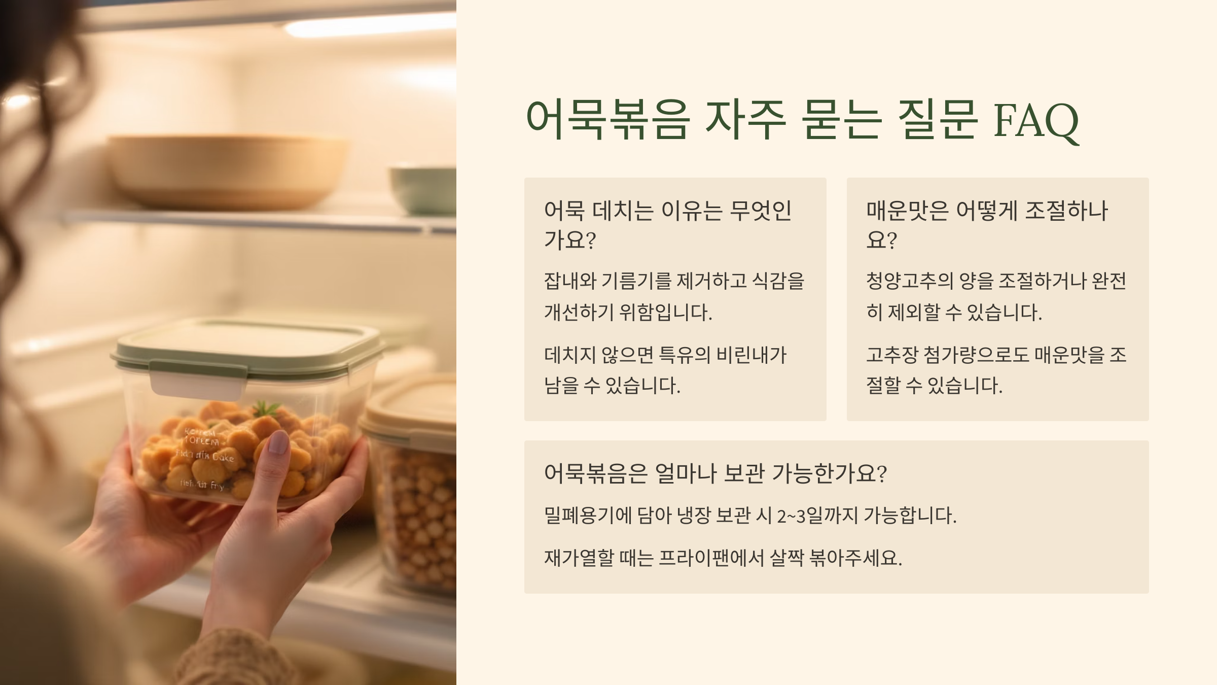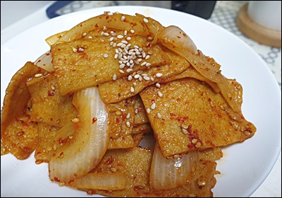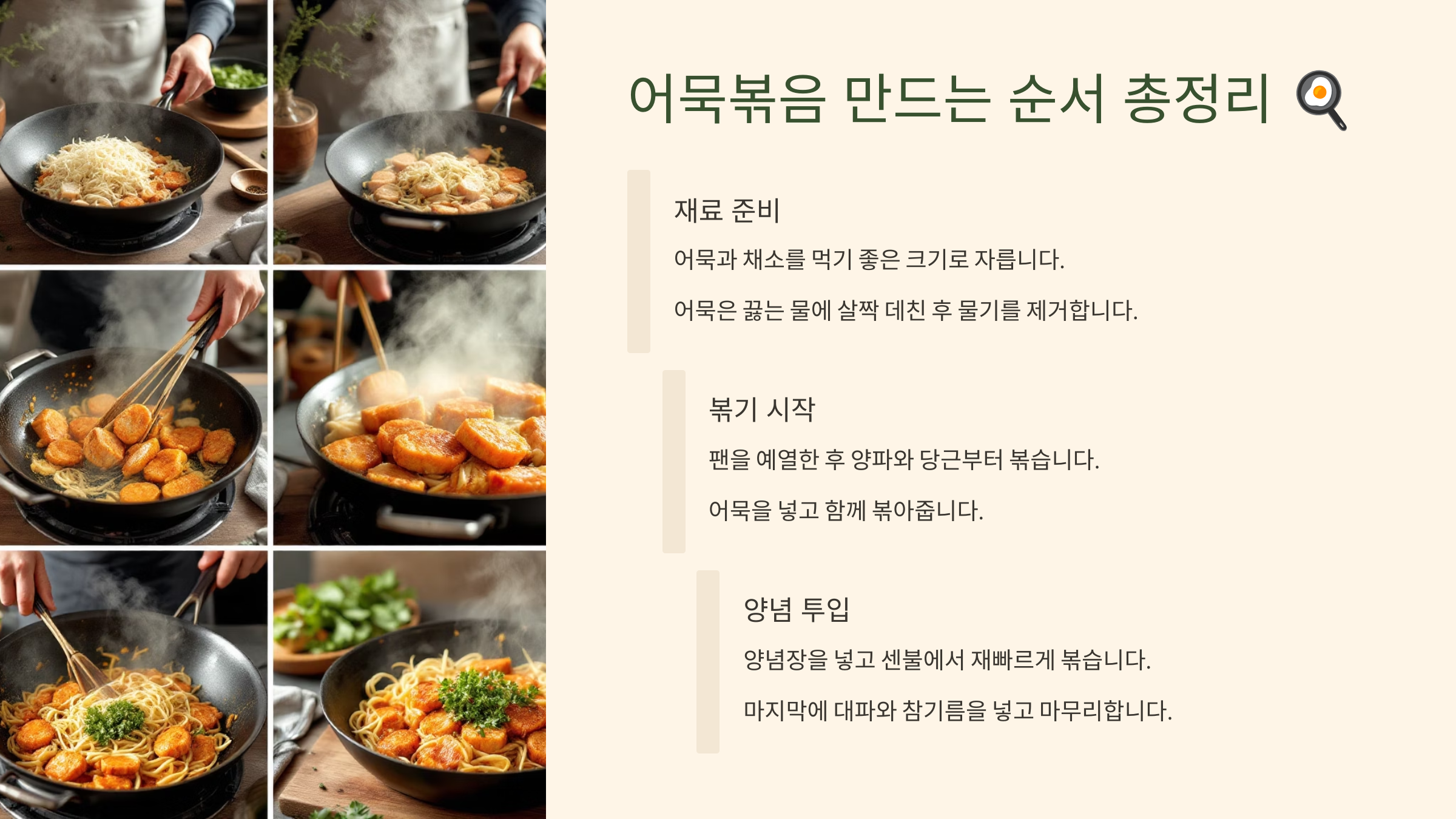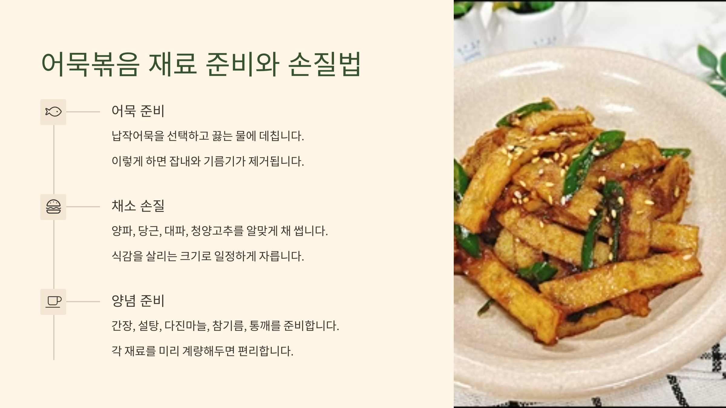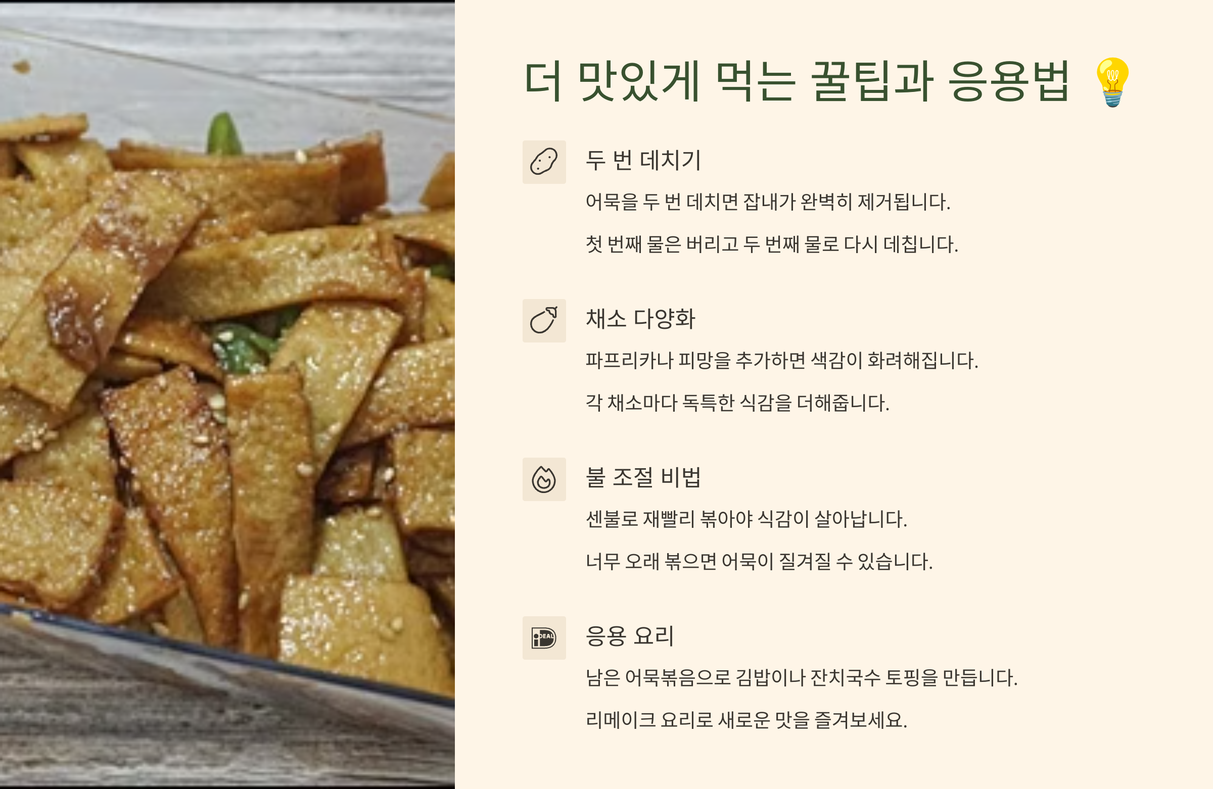 | 어묵 (판형) | 데친 후 물기 제거, 사각썰기 | 기름기 제거, 양념 흡수↑ |