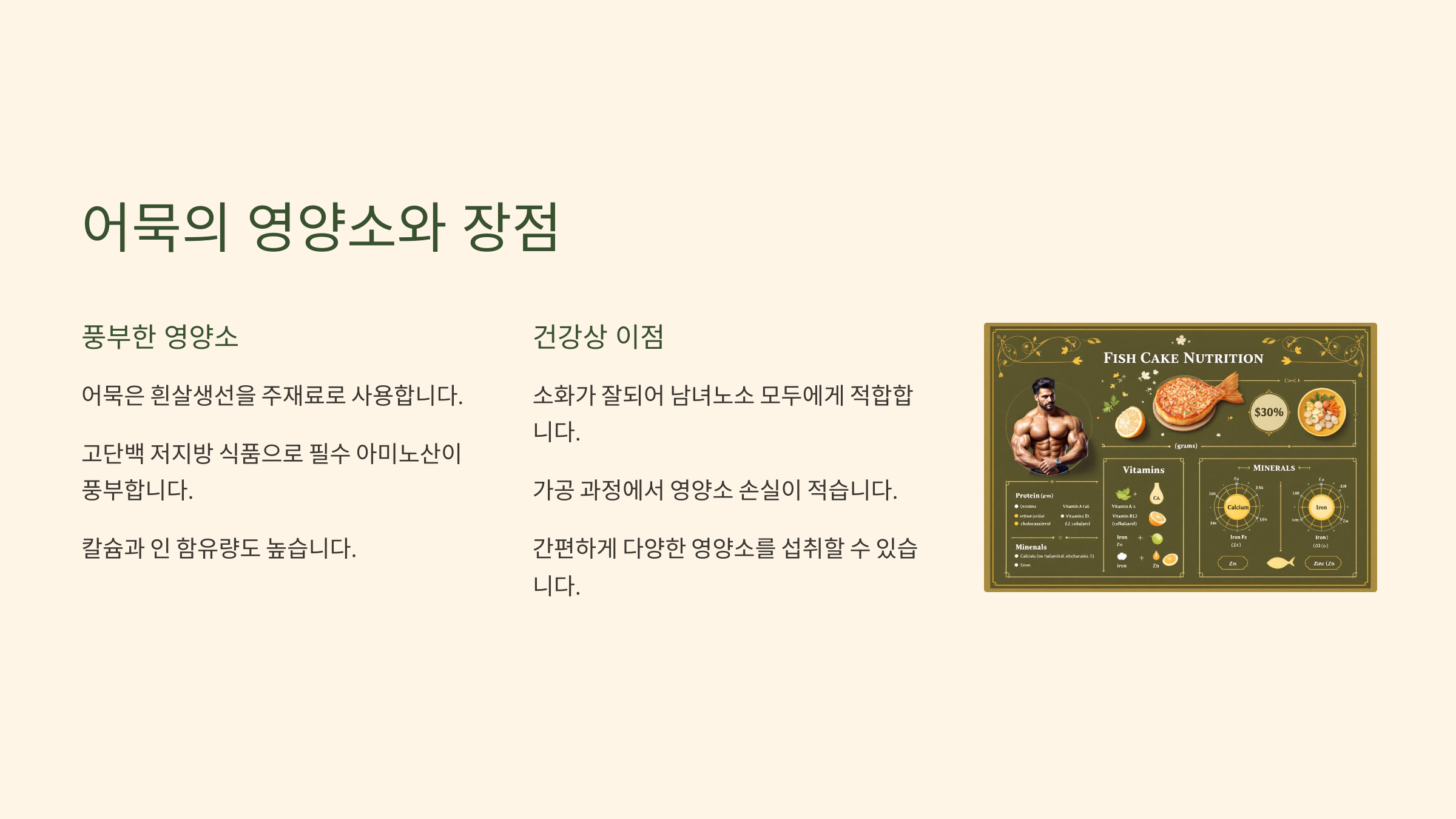어묵은 생선살을 갈아서 만든 식품이기 때문에 단백질 함량이 높고 소화가 쉬운 편이에요. 어린아이부터 노년층까지 부담 없이 먹을 수 있는 반찬으로 손꼽히죠. 특히 조리법에 따라 칼로리와 염도를 조절할 수 있어 다양한 식단에 활용돼요.
