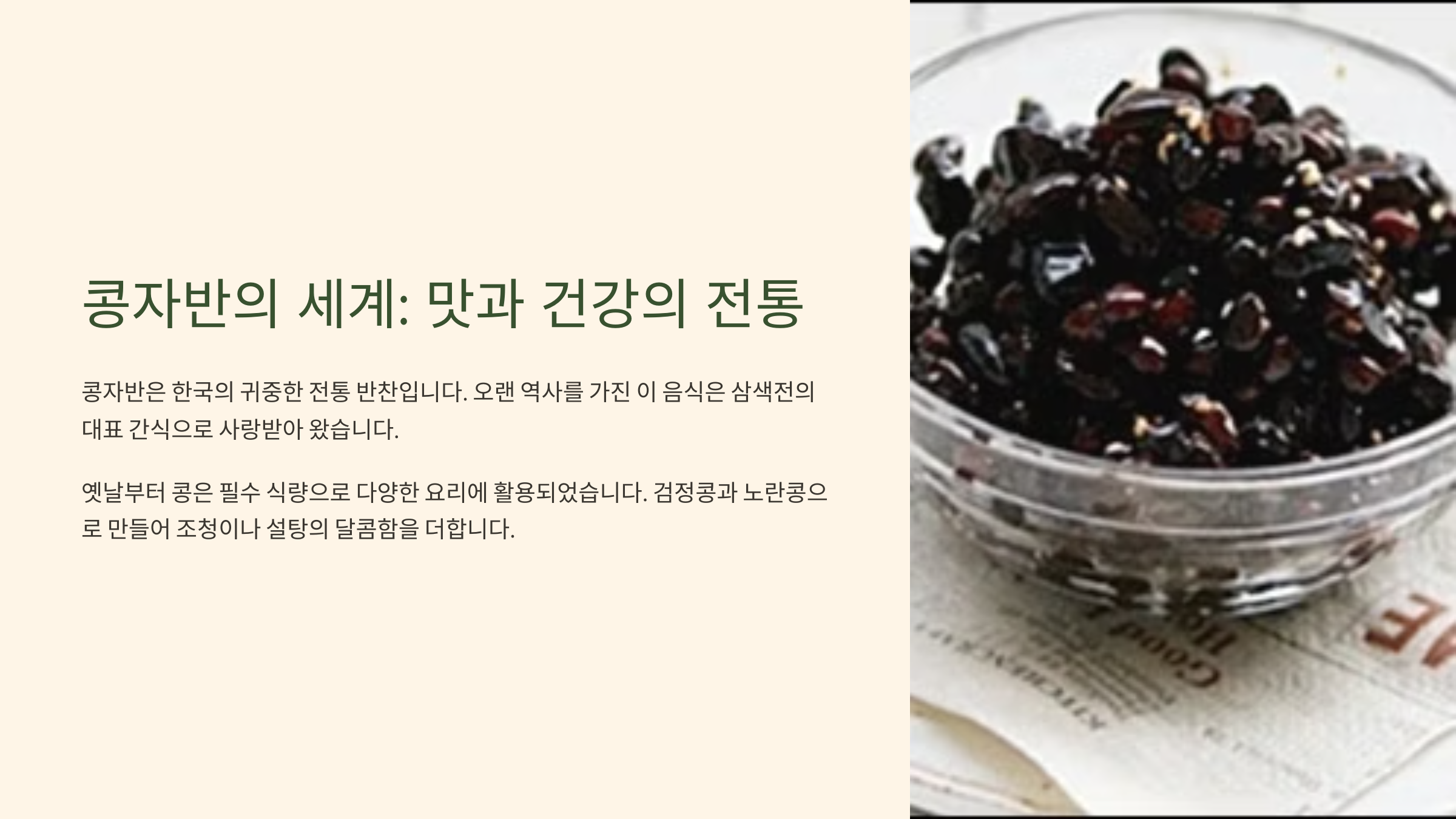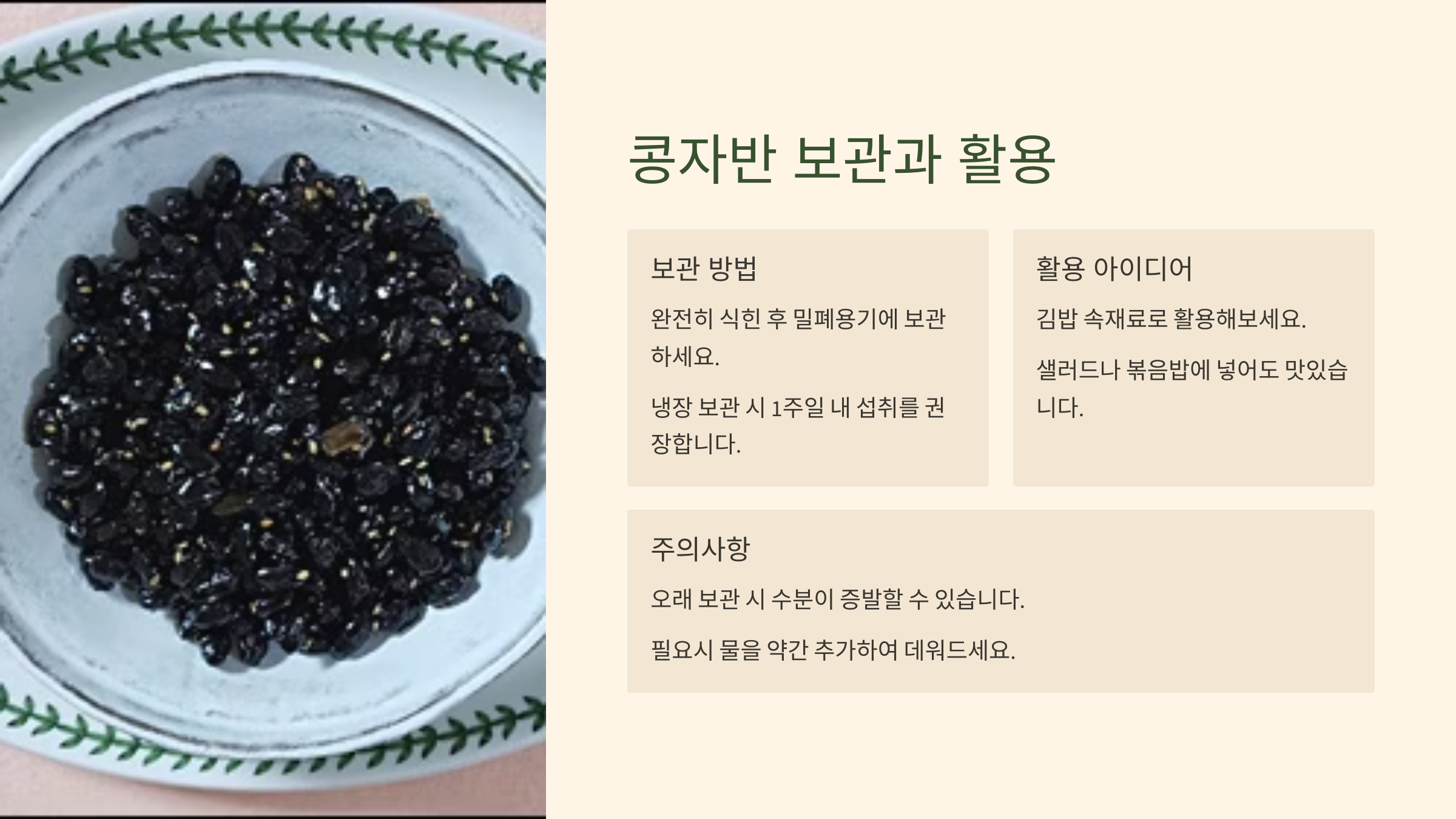 오늘날에도 콩자반은 급식이나 도시락, 식당 반찬에서 흔히 볼 수 있을 만큼 익숙한 음식이에요. 단순한 조리법이지만 맛을 잘 잡으려면 은근한 노하우가 필요하죠. 요즘엔 어린이용 반찬으로 짜지 않고 단맛을 조절한 버전도 많이 나오고 있어요.