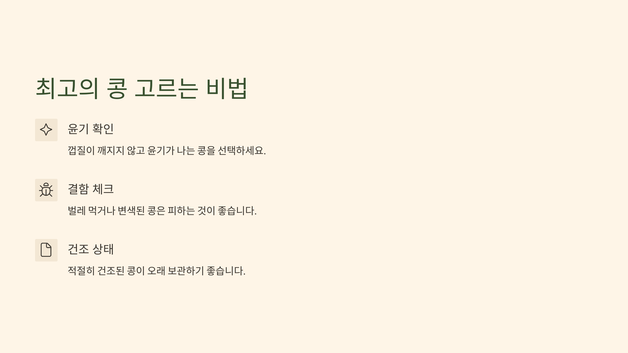 구매할 때는 껍질이 깨지지 않고 색이 균일한지, 잡티나 이물질이 없는지 확인해야 해요. 윤기가 흐르고 알이 굵은 콩일수록 신선하고 품질이 좋은 경우가 많아요. 오래된 콩은 삶았을 때 퍽퍽하거나 비린내가 날 수 있으니 주의해야 해요.