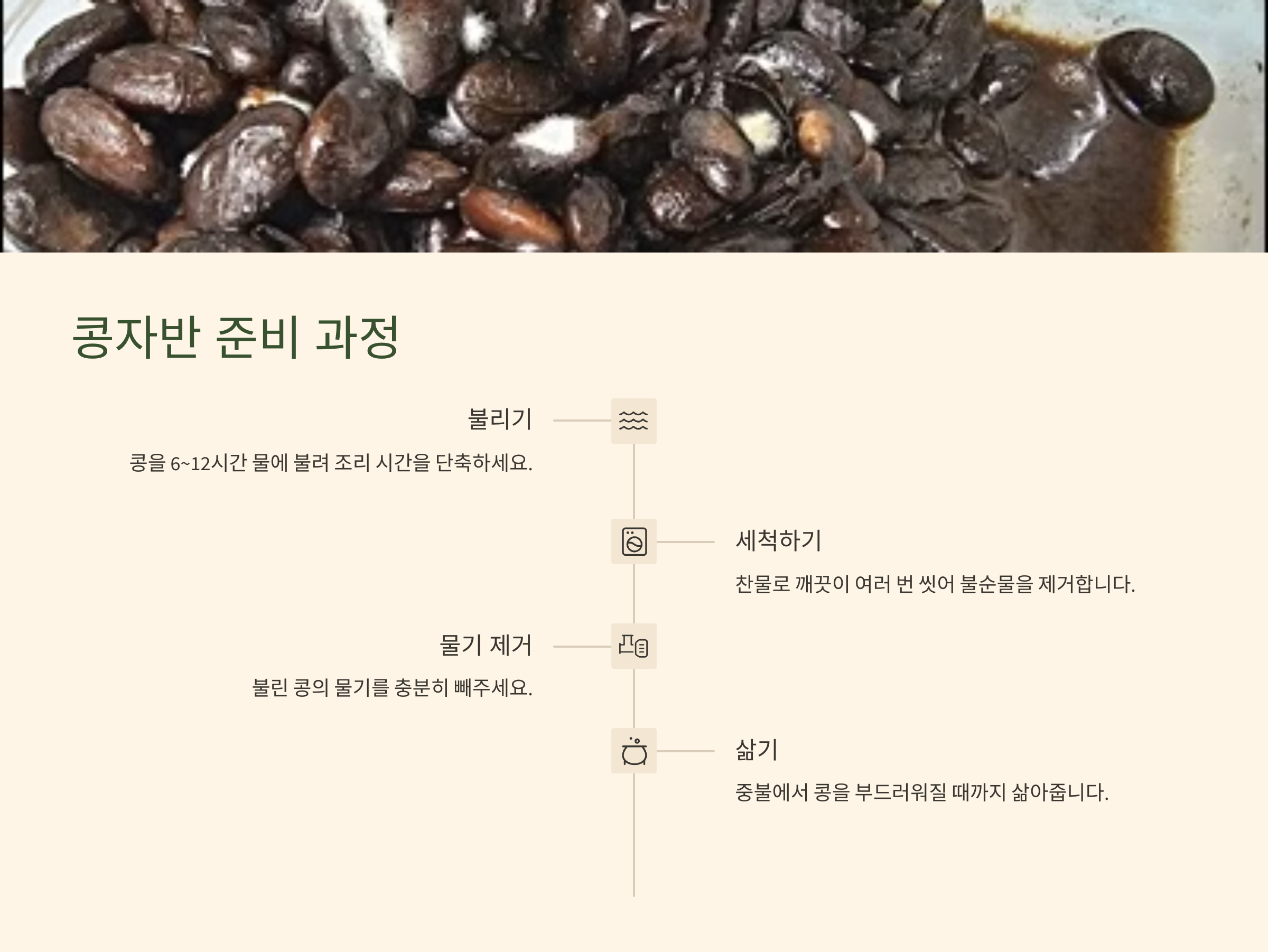 그다음은 불리기 과정이에요. 콩은 물에 최소 6시간 이상 충분히 불려야 해요. 이 과정을 통해 콩 내부까지 수분이 흡수되어 익힐 때 골고루 부드럽게 익고, 조리 시간이 단축돼요. 바쁜 경우라면 미지근한 물에 2~3시간 정도로도 어느 정도 가능해요.