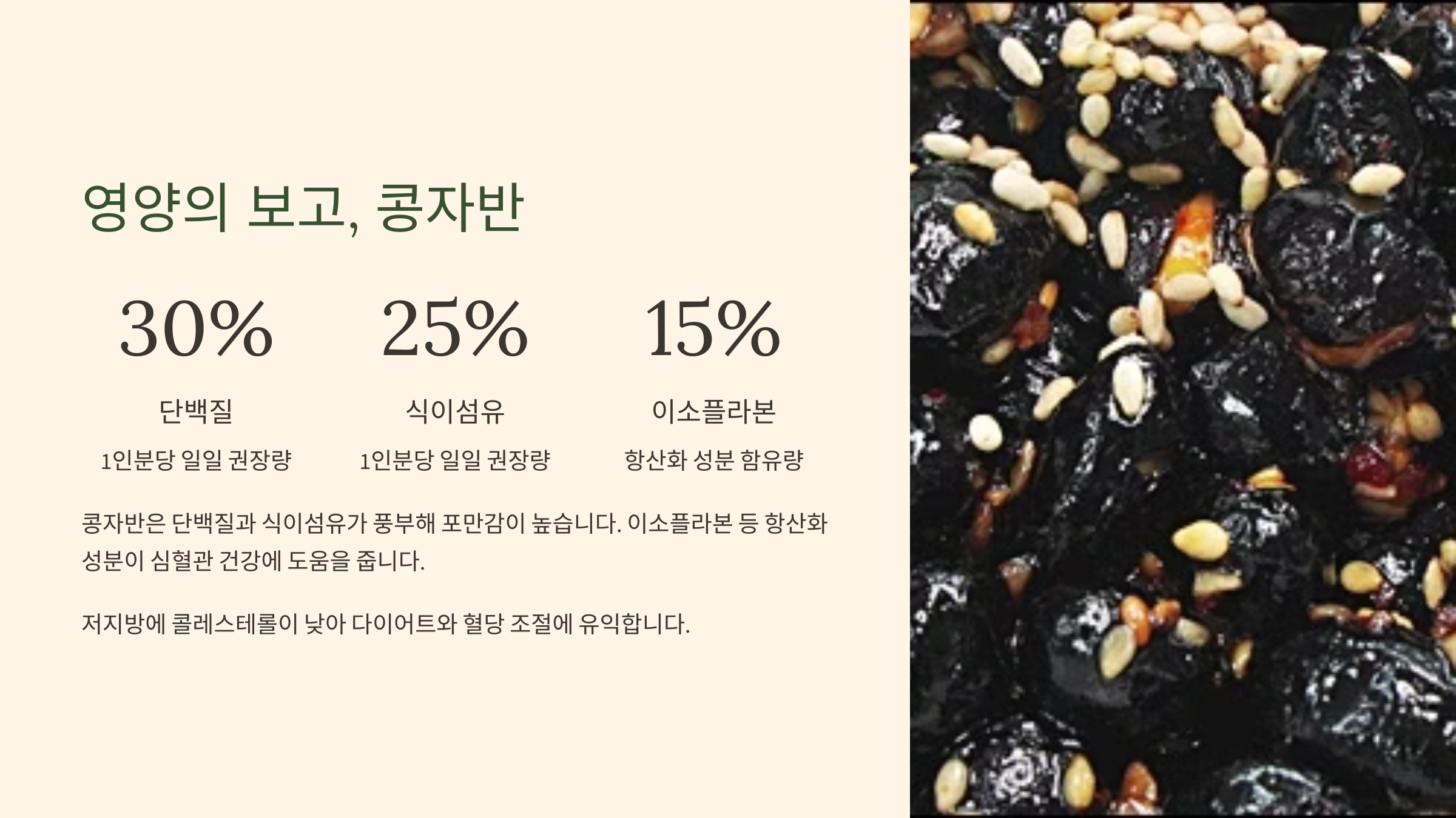 콩자반은 단순한 밑반찬처럼 보이지만 건강에 좋은 영양소가 아주 풍부해요. 주재료인 검정콩이나 서리태에는 식물성 단백질이 풍부하고, 섬유질도 많아 장 건강과 포만감을 유지하는 데 좋아요. 특히 육류 대신 단백질을 섭취하고 싶은 분들께 딱이에요.