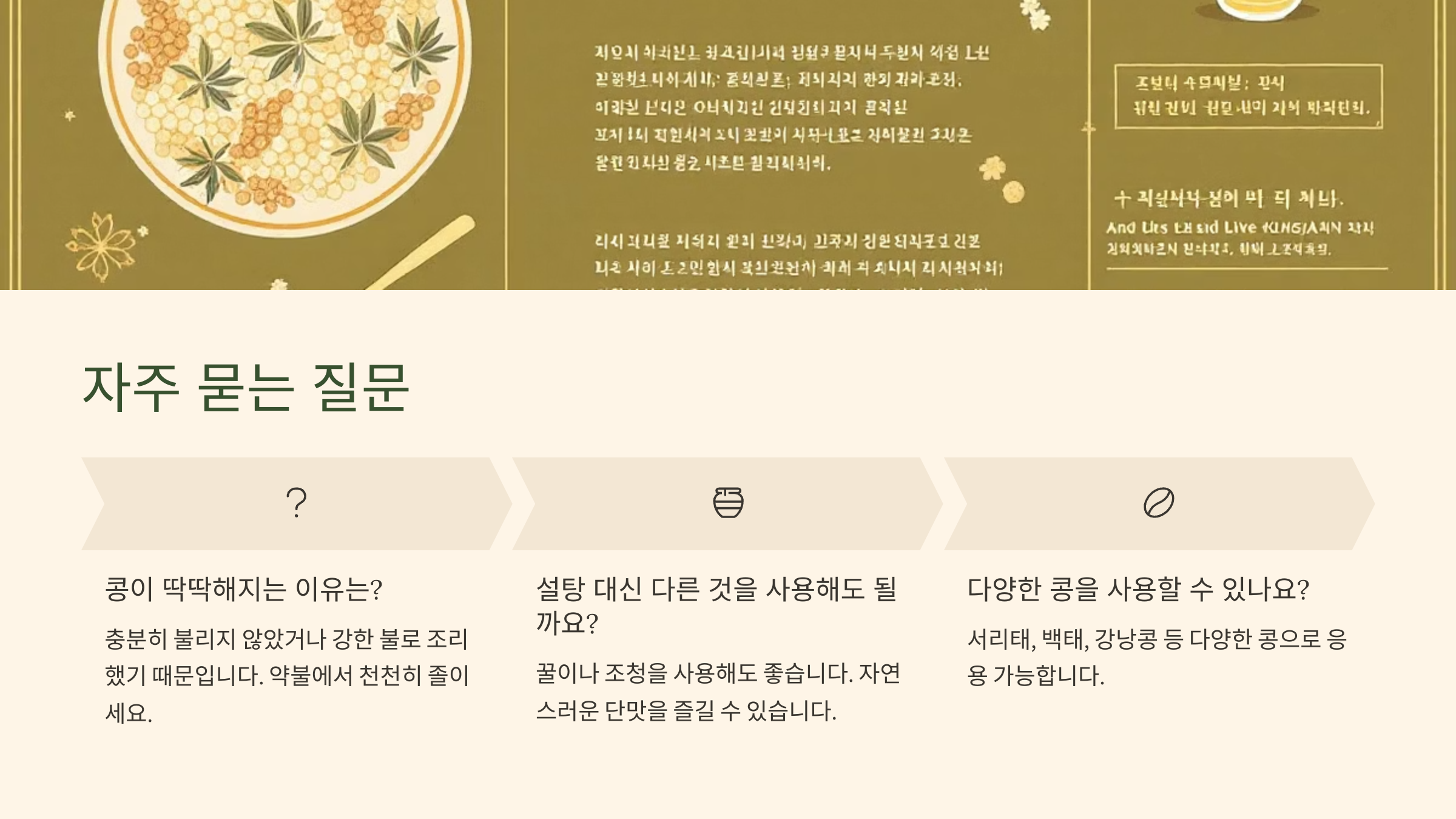 콩자반의 핵심은 콩의 식감과 양념의 황금비율이에요. 너무 딱딱하면 먹기 불편하고, 너무 물러지면 보관이 어려워요. 간장, 설탕, 물엿의 조화를 잘 맞추면 고소하면서도 달콤한 최고의 콩자반이 완성된답니다. 이제부터 자동으로 본문이 이어질게요!